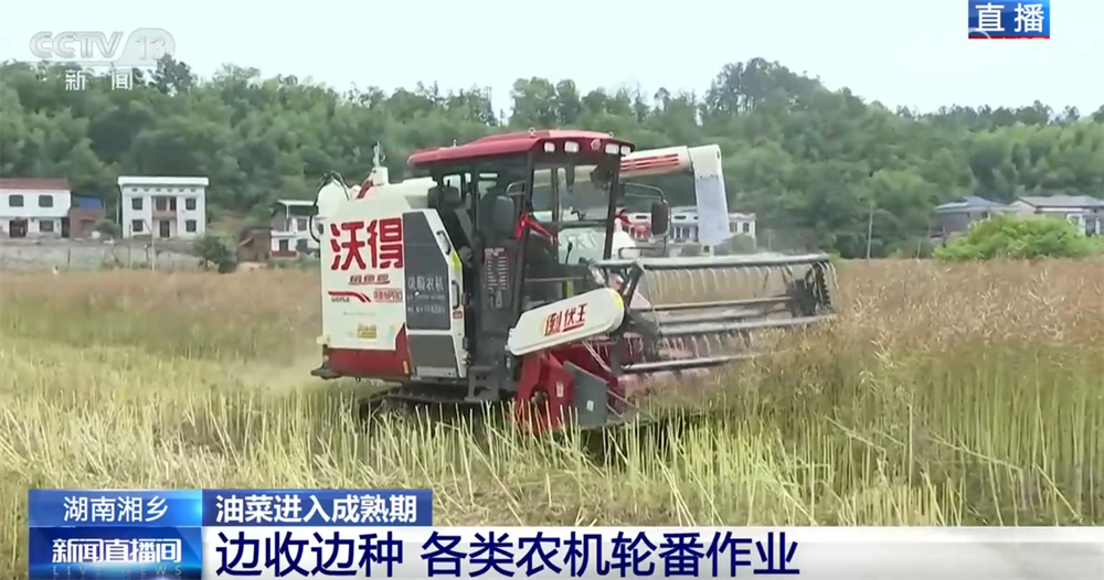 正在一眼望不到头的田里,各类农机正正在火热功课。起首,不少油菜籽曾经成熟了,不远处,专业的收割机正正在敏捷采收,确保颗粒归仓。种植户引见,本年得益于天气和农田,油菜籽的亩产有所添加。